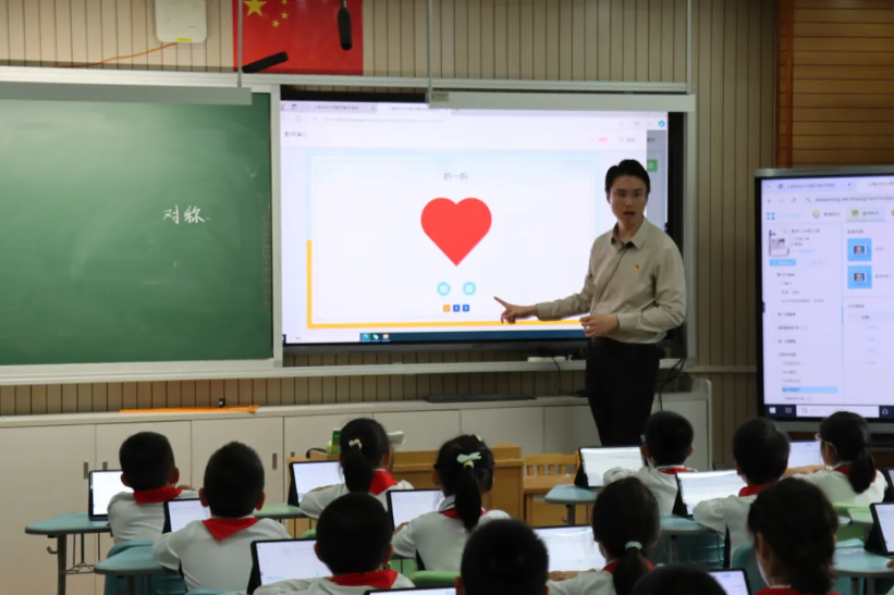 杨杰老师依托“三个助手”数字化平台,创新性地开设了一堂三年级的《轴对称图形》,充分利用技术突破教学难点。课堂教学充分展现了三大特点:一是动态演示突破抽象概念,即通过平台动态演示图形翻折重合过程,直观解决传统教具静态展示的局限,帮助学生理解“对称轴”本质;二是实时反馈精准诊断学情,即平台即时捕捉学生典型错误(如混淆“对折”与“剪拼”、误判斜向对称图形),教师针对性纠偏,为学习困难学生提供支撑;三是探索拓展深化思维,即引导学生用两个相同图形拼摆斜向对称图形,并通过平台验证翻折效果,培养空间观念与探究能力。