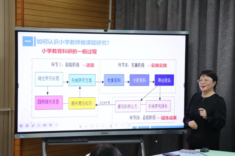 结合本次研修活动主题,刘兰英做了题为“基于教学实践的研究选题与设计”的微讲座。她从如何认识小学教师做课题研究、怎样基于实践问题选择科研课题、如何恰当地陈述科研课题名称、怎样设计科研课题的研究方案等四个方面分享了“如何将教育科研和课堂教学结合起来”的这一话题,鼓励研修学员从课堂实践中寻找研究课题,使课题研究源于实践、高于实践并反哺于实践。