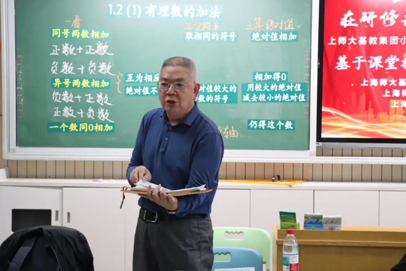 专家点评环节,特级教师潘小明高度肯定了两节课的“真问题驱动”设计,欣赏杨杰老师一课在生成性问题中培养学生空间观念,王雯青老师的课例通过分类归纳实现算理结构化的创意设计。同时建议老师们进一步放手让学生自主探究,如用例证方法说明如何创设问题空间激励学生更好地基于整数加法经验迁移探究自主构建有理数法则。