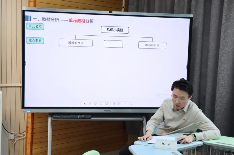 说课环节,杨杰老师聚焦《轴对称图形》单元设计,剖析“技术赋能”如何攻克概念抽象、操作繁琐等痛点,强调数字化工具对学生几何直观素养的支撑作用。王雯青老师则从核心素养目标出发,分析六年级课堂定位,提出通过口诀提炼、数轴建模及分类思想渗透,弥合小初知识断层。