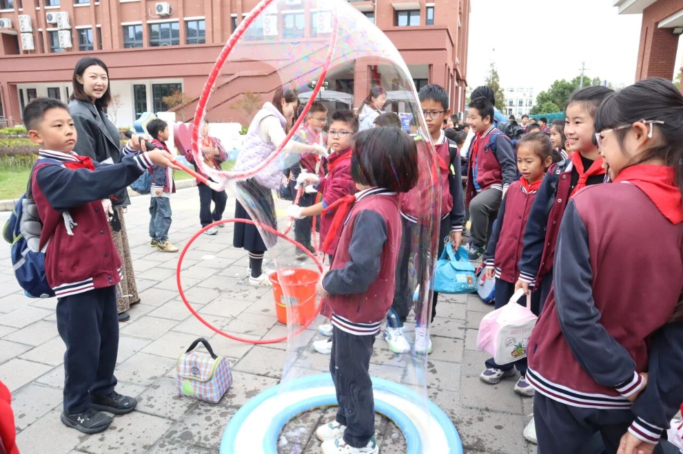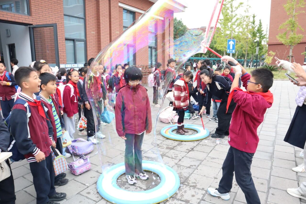 阳光下的泡泡不再是脆弱易逝的童话,在老师们的“魔法”下,它们变得巨大无比,甚至能将同学“装”进去!孩子们穿梭在晶莹剔透的泡泡中,欢声笑语里,他们直观地感受到了表面张力的神奇。