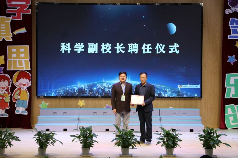 开幕式上,上海师范大学松江科创实验学校党支部书记兼常务副校长黄辉为上海师范大学信息与机电工程学院副院长(主持工作)潘建国教授颁发科学副校长聘书。红色聘书承载着上海师范大学松江科创实验学校对科创教育的重视,期待潘校长的加入为校园注入更多科技活力,助力学生探索科学奥秘。